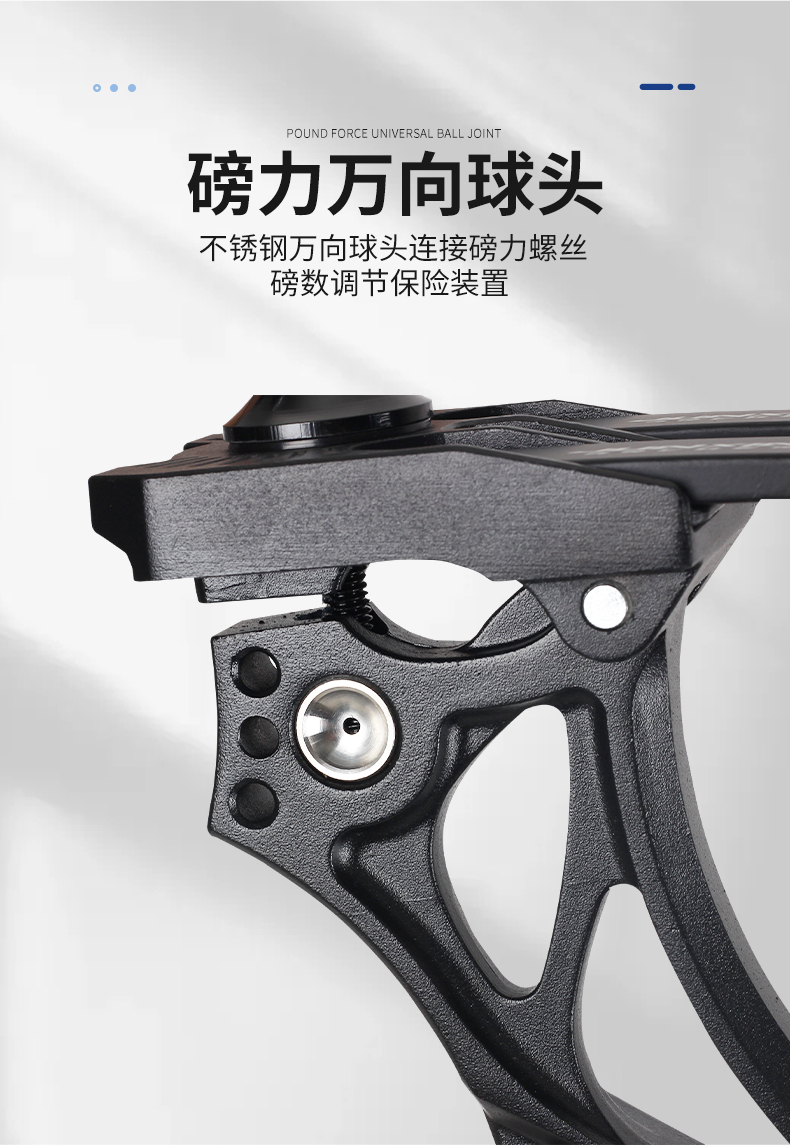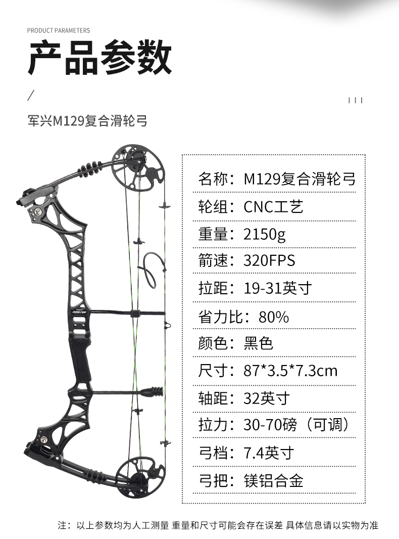 M129复合滑轮弓不锈钢万向球头链接磅力螺丝,磅数调节保险装置。小轮组射击省力比达到80%射击平衡拉杆舒适,镁铝合金材质弓把轻30%强度大,造型独特弓弦黑绿搭配美观新颖简约大气