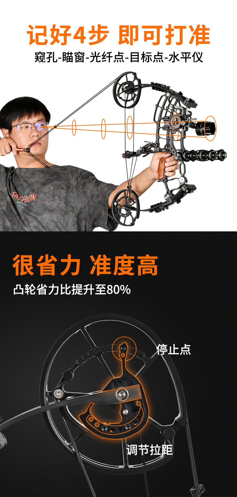 恶棍两用复合滑轮弓威力大射击精准,凸轮省力比提升至80%;很省力射准度高,30-70磅范围可调大区间拉力可调,1200次拉弓测试无爆丝无爆片,72小时弓片压力测试释放弓片性能不产生爆丝爆片,不受温度影响寒冷高温弓片回弹均无影响,低应力握把直抵大鱼肌发力