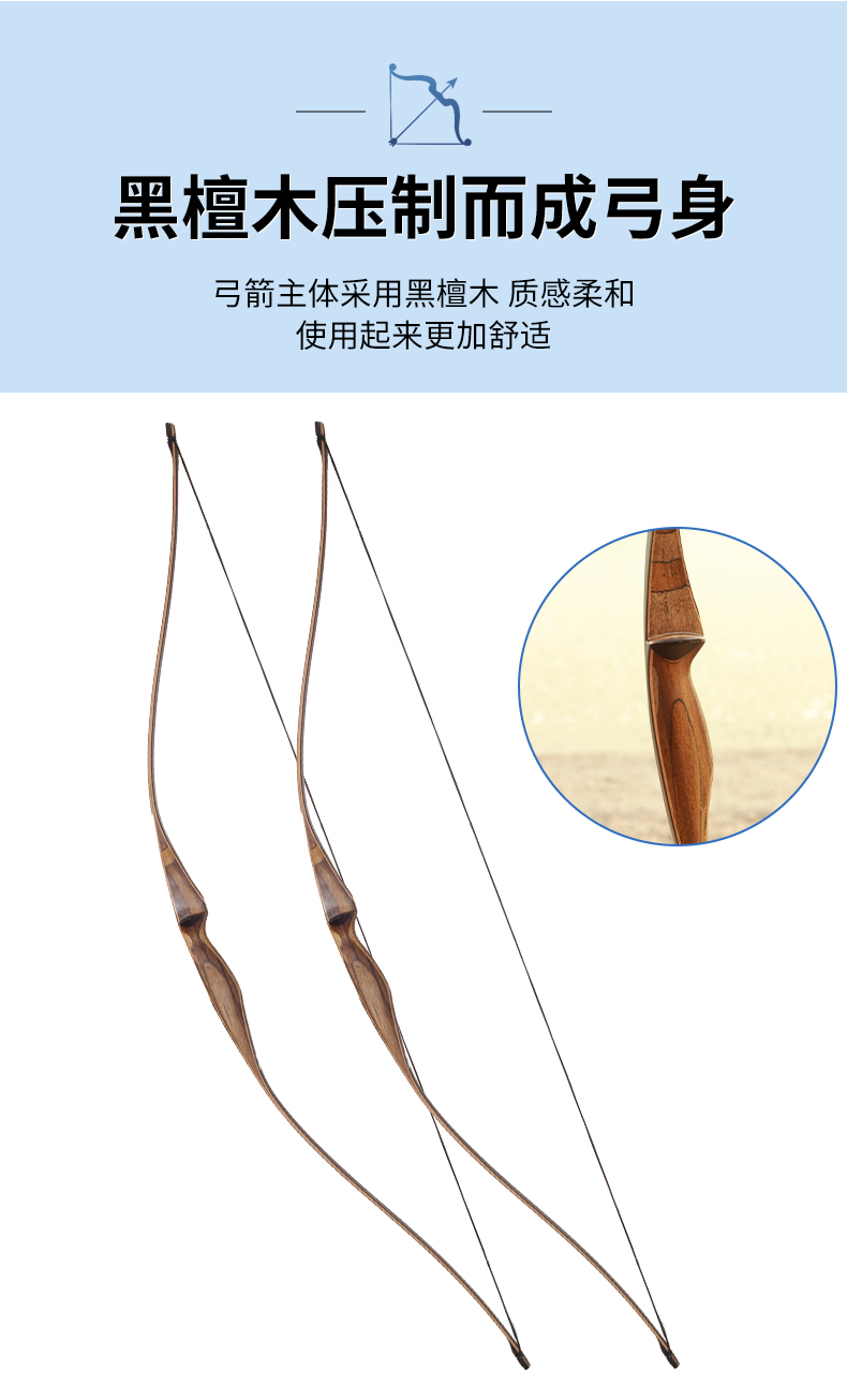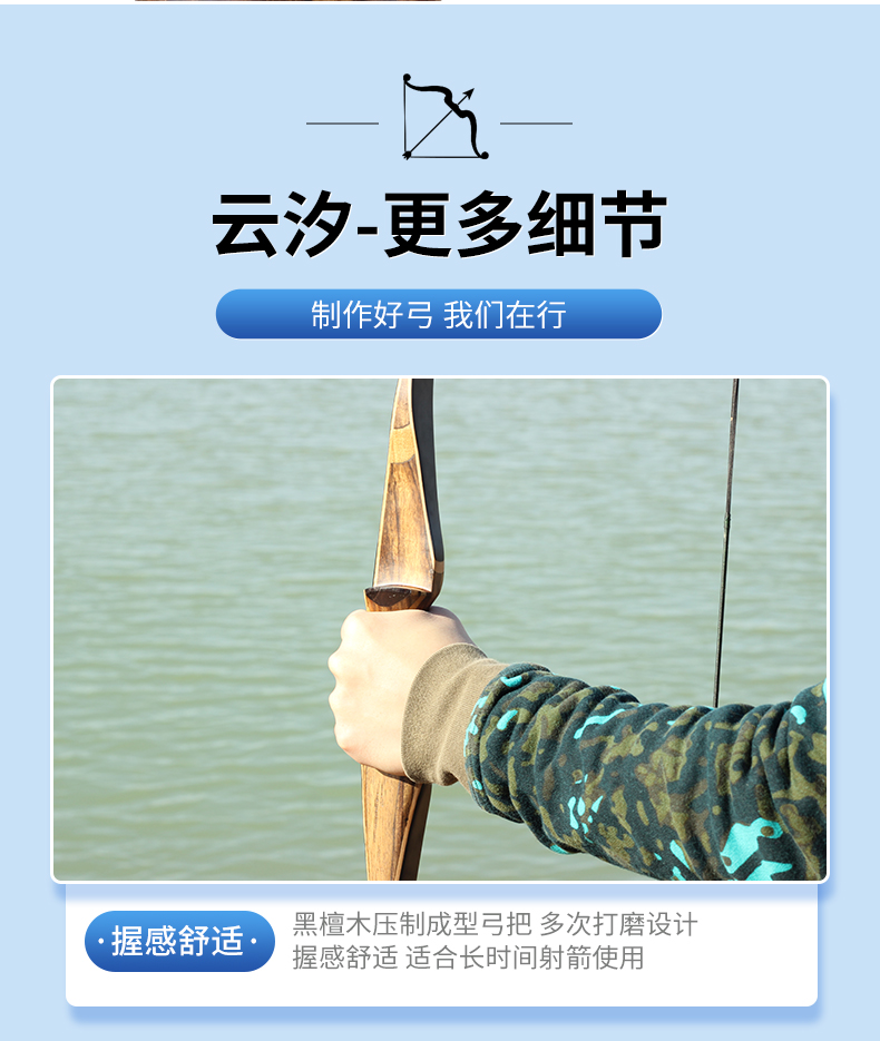 云汐一体美猎弓采用杠杆原理省力不失威力初速更快准度更高,黑檀木压制而成弓身质感柔和,一体式设计不易断裂损坏使用时间长,层压弓片木材紧密纹理均匀拉杆柔和适合长时间使用,反曲弓弦性能稳定容错度高可以校正出箭时的偏移提升射箭准度弓窗设计可以给出无阻碍视野